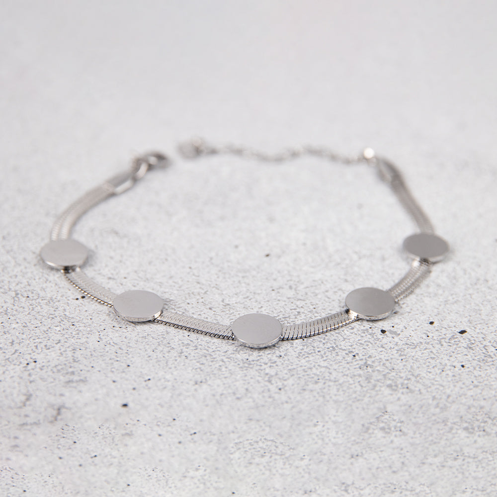 La Pulsera Cósmico, parte de la colección Niebla de MORTAL, es una joya que irradia sutileza y elegancia. Esta pulsera presenta una textura plana y delicada, adornada con cinco círculos planos de acero inoxidable, que aportan un toque moderno y minimalista.